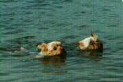 この写真はわたしの主人あさきち君と一緒に琵琶湖に行ったときのものよ。なかよく泳いでいるでしょ。左側が私よ。かっこいいみたいだけど必死に泳いでいるのよ。私あまり水につかるの好きじゃないの。でもあさきち君は勇敢でわたしたちのおかあさんがおいでって呼んだら水に飛び込んでいくのよ。この頃は私も年だしおかあさんも年だしほとんど連れていってもらってないの。たすかるわ。